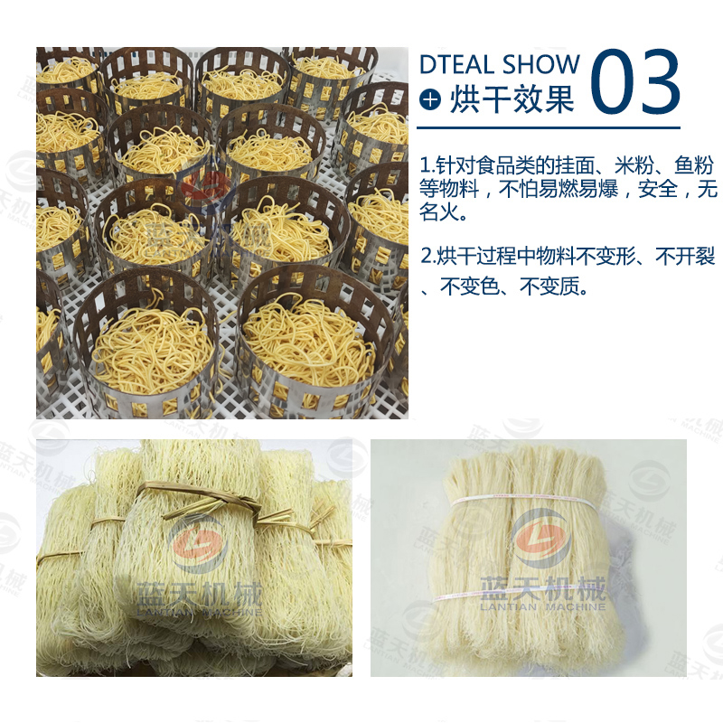 ④不同地域和米粉的種類不同,一般使用米粉烘干機(jī)設(shè)備的烘干時間在8-12小時。這樣烘干出的米粉不變色,不會斷,干度均勻,口感佳,復(fù)水性好!同樣適用于面條、紅薯粉等烘干處理。