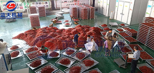 工人們在將辣椒攤放在辣椒烘干機(jī)的物料盤中
